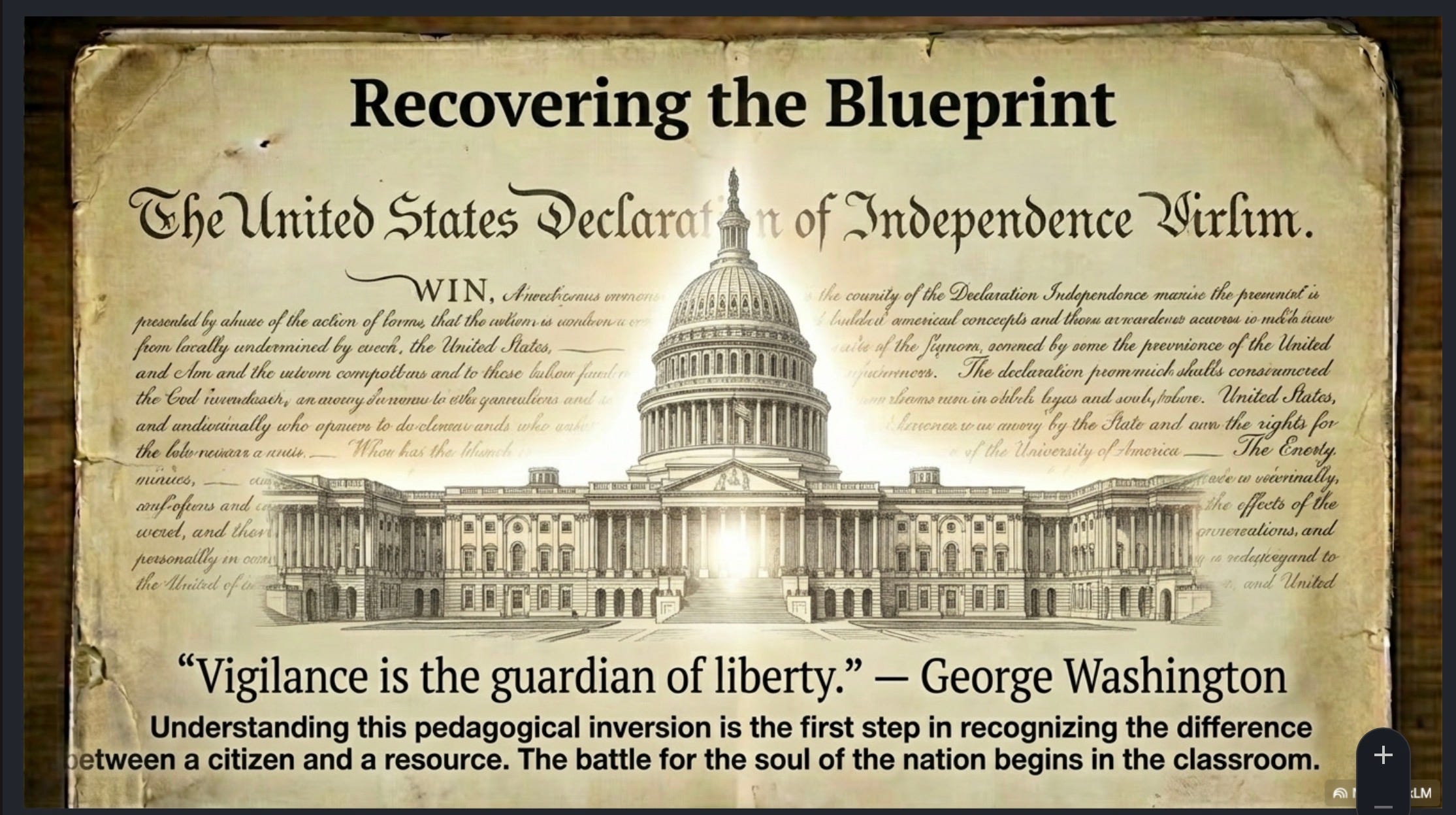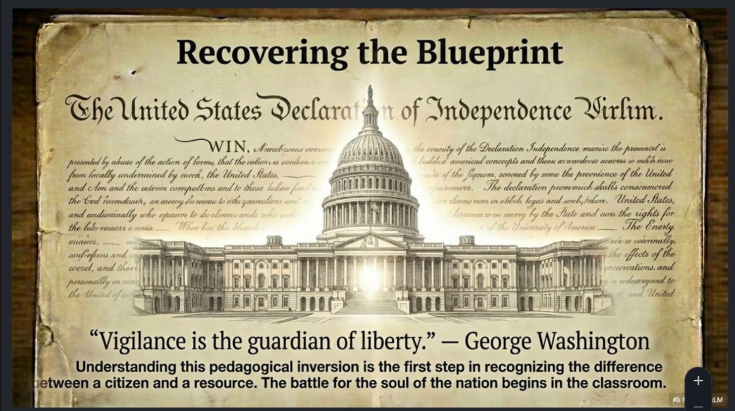 Unless this is all learned and comprehended as part of the professional training for Teachers, Lawyers and all Public Office holders swearing an oath of office to uphold and defend the Constitution, nothing will change and those professionals are not going to learn any of this as a hobby in their ‘spare time’ - and nor should they! It takes a great deal of effort and time to comprehend and the huge obstacles are the existing accrued misapprehensions through unexamined premises and language deception. This requires skilled structured in person teaching and support for those learning it. Now where is the political will, the finance, the resource and the infrastructure for that? Where is the commitment to Institutional Stewardship for this knowledge and practise? The America 250 Celebrations so far look to be all about that subversive term ‘Democracy’ which the Founders fought so hard to reject and defend against. The media AI mini biographical pieces on the Founders themselves are very engaging but they teach none of this. The presentations on American Civil War History likewise teach none of this. Everything ‘out there’ is cosmetic only. There is nothing whatsoever about the necessary understanding of the human person that the Founders encoded and enshrined in the Declaration of Independence. So far there is much in the name of celebrating America’s Founding which in function is serving to negate it and the media consuming public is not even aware of this even as it’s happening. Who will resource and operationalize the institutional stewardship of Washington’s legacy now - of Vigilance itself?