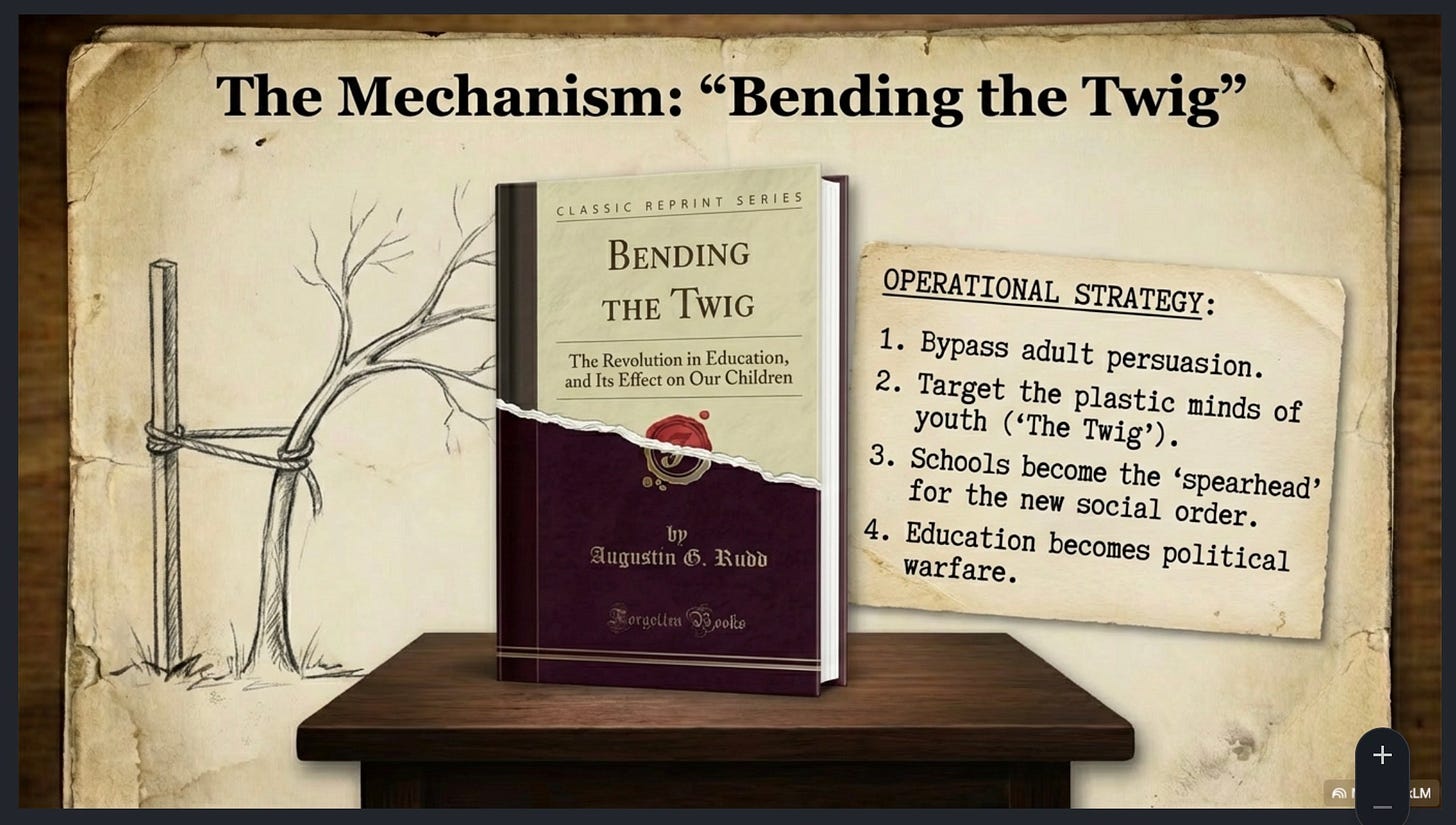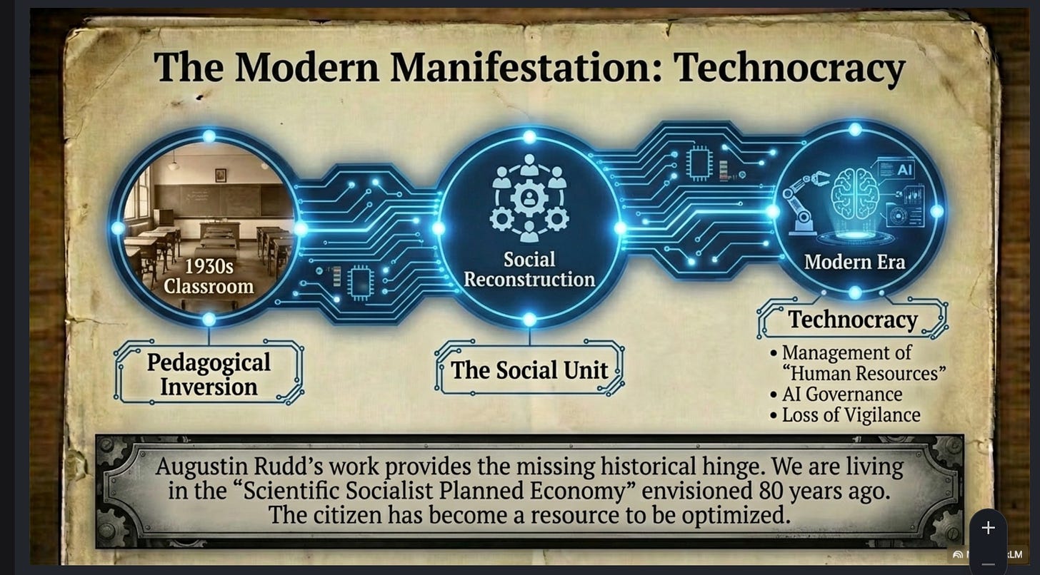 This classical model of the vigilant citizen, however, became the primary target of a 19th and 20th century ontological replacement (by enemies foreign and domestic) movement designed to dismantle the very foundation of individual sovereignty. To (as Andrew Carnegie proudly proclaimed; ‘take back America’). Note Carnegie’s financial, strategic and tactical role in the long campaign, deployed through education as weaponized statecraft. There is a reason my pinned post on X is a thorough breakdown with analytical commentary of Augustin Rudd’s excellent book documenting the subversive ‘New Education’ movement and it’s essential required reading to understand how and why America is in the position it’s in now. How and why we got here: