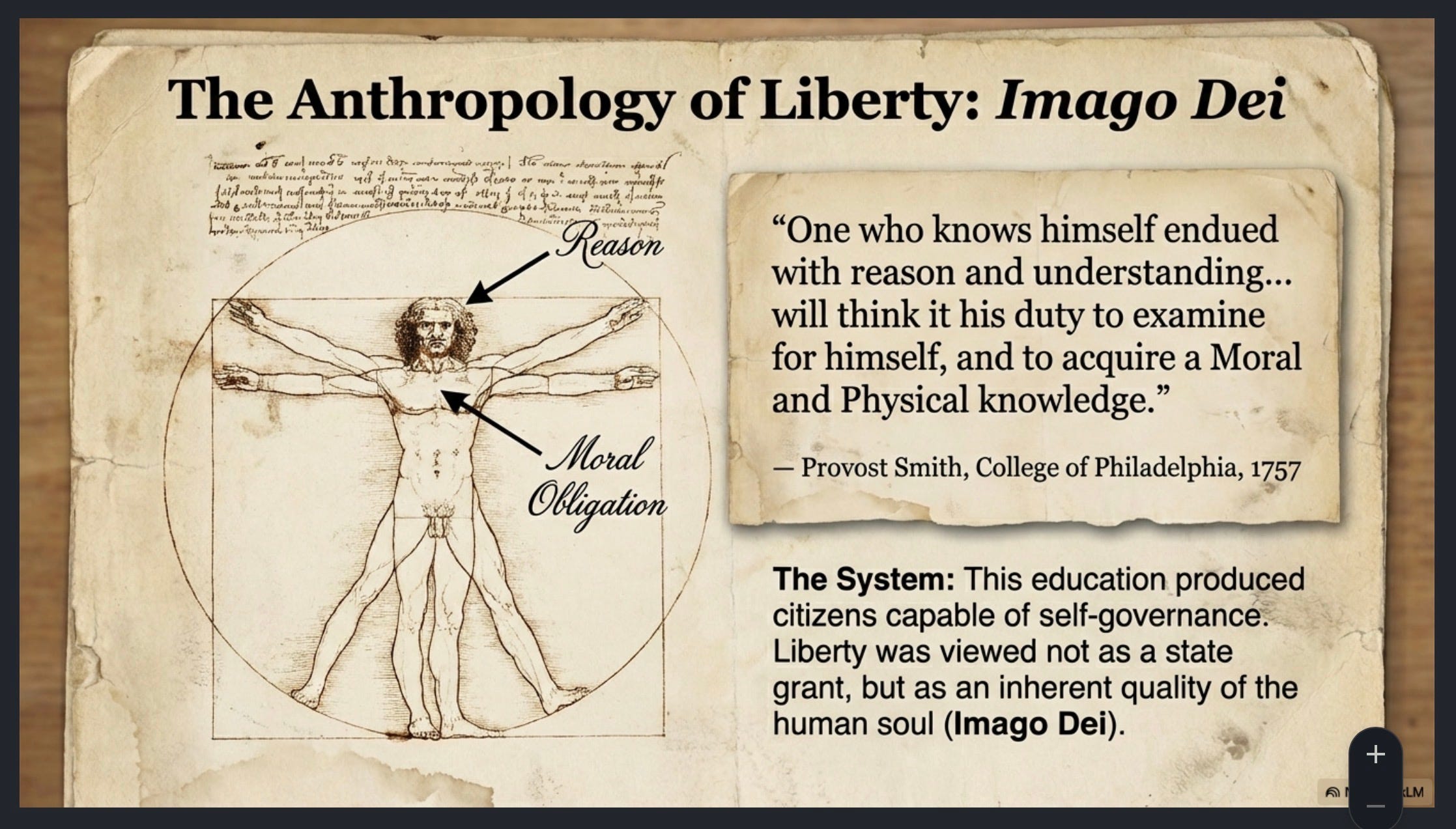 The anthropology of this era viewed the individual as a moral agent - imago Dei -created in the image of God. This metaphysical premise was the anthropological precondition for a rights-based order. Because man was understood as a being with a soul and intrinsic dignity, his rights were recognized as inherent and grounded in Natural Law, rather than granted by the state (as per the British and European governance systems. America alone was unique in this and remains so today). This Scholastic understanding of self-evident truths, stated in America’s Declaration of Independence, created a citizenry whose primary duty was vigilance at scale.