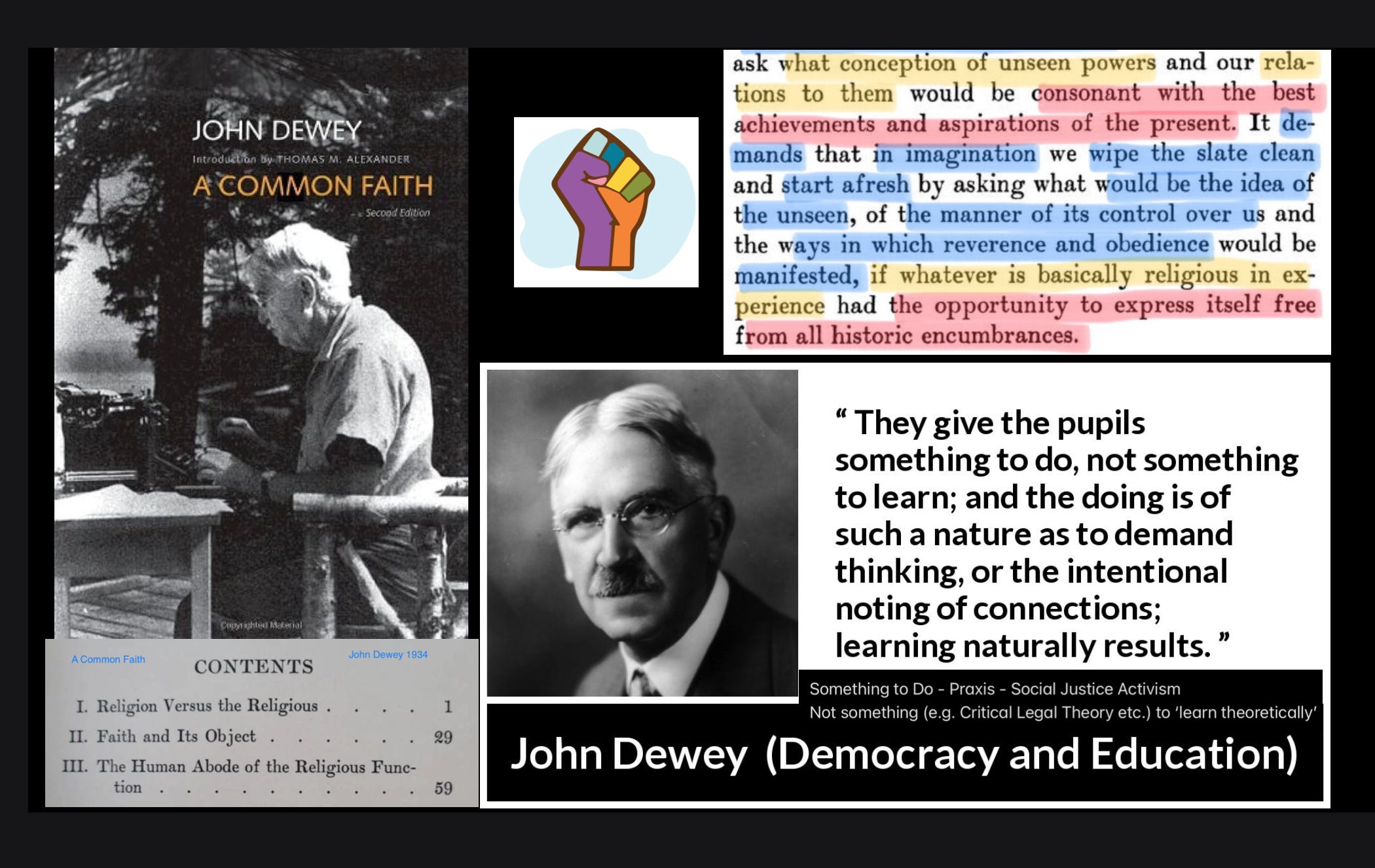 For a detailed breakdown of the specific incompatibilities between The Humanist Manifesto (Dewey was a key signatory and instigator of the Council of Foreign Relations, in addition to being the person responsible for bringing Horkheimer et al of the Frankfurt School to Columbia Teachers College, setting them up to operate in America) and the Declaration of Independence, see here: