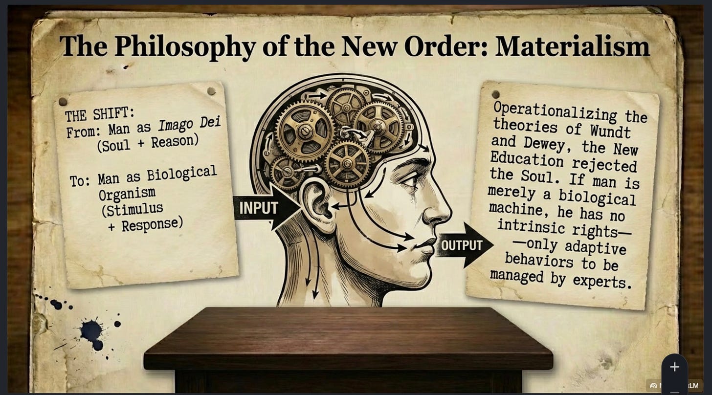 The Deweyite apparatus operationalized Wundtian behaviouralism, treating the American student as a ‘biological organism’ devoid of a soul. This “Skinner Box” model of education focused on adaptive behaviour and environmental conditioning rather than the cultivation of reason. By treating man as a stimulous-response beast without intrinsic rational faculties, conscience and moral agency (inherent dignity), the educationists established the anthropological precondition for technocratic governance.