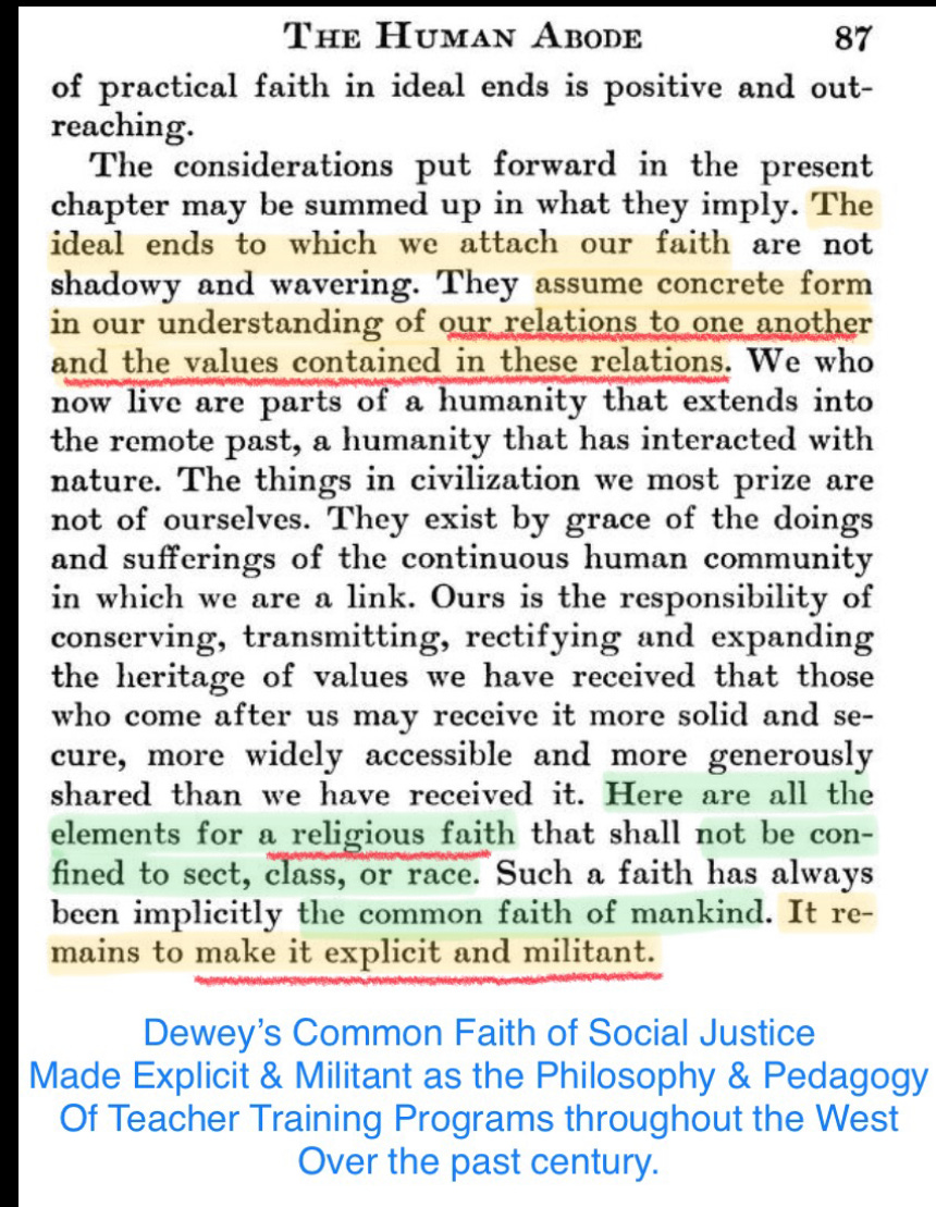 George Washington warned in his Farewell Address that the purpose of education was to maintain “vigilance at scale.” In a constitutional republic, the citizens are the government; if their capacity for independent judgment is destroyed, the republic ceases to exist in function, despite its apparent patriotic cosmetic veneer. The Deweyite model was the instrument used to attack and destroy this capability, “bending the twig” away from the practice of vigilance and toward the passivity of the managed collective. The poisoned fruits of this inversion are visible today in modern Social Justice Activism. Students are conditioned for political participation and protest( frequently violating due process) before they understand the legal and moral responsibilities of citizenship. You saw it in Black Lives Matter protests and you’re seeing it now in Minnesota. The transition from the formation of judgment to the manufacturing of activists for a pre-defined social order happened over a century ago and Dewey’s ‘A Common Faith’ was transparent;