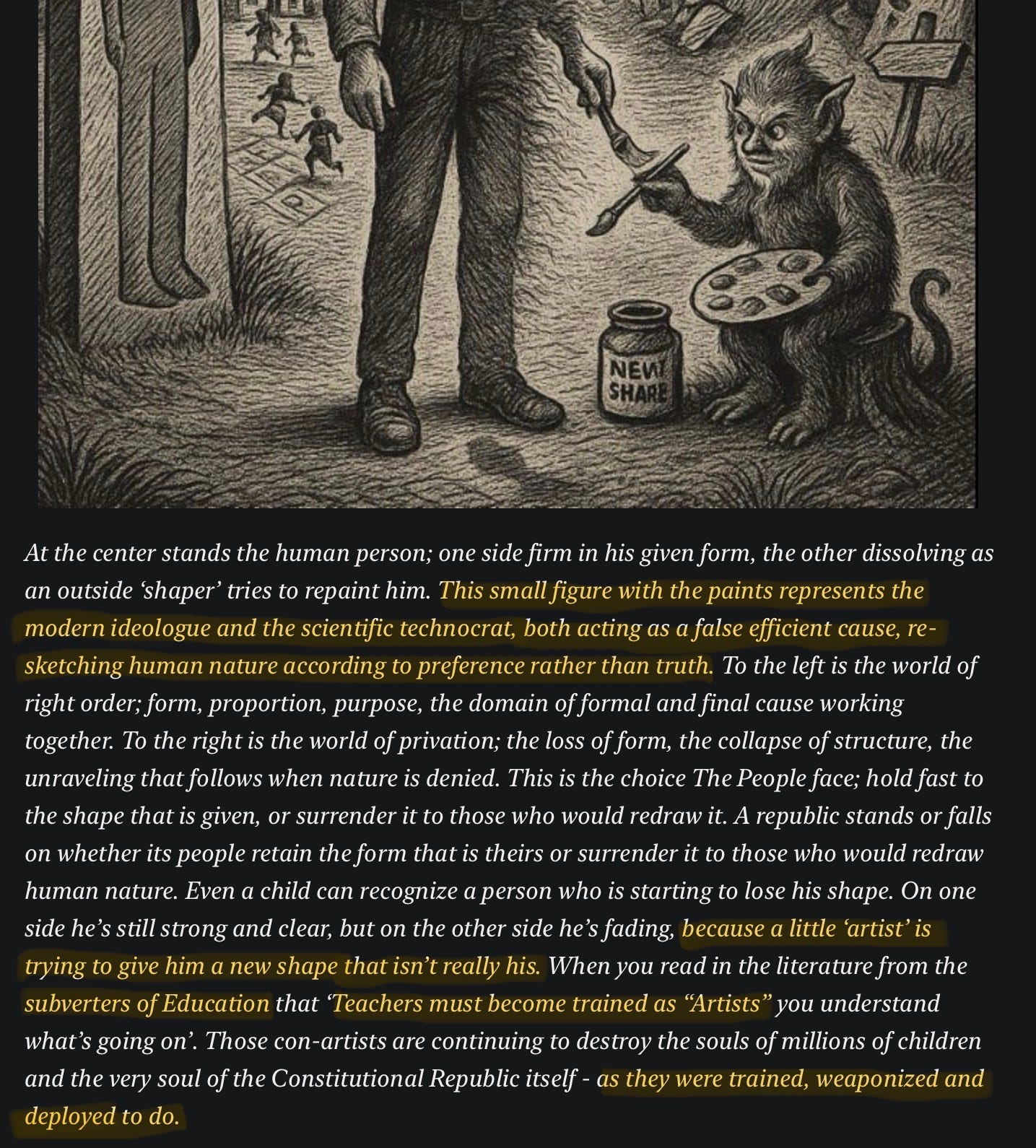 The defining crisis of modern Western civilization is the shift from the individual as imago Dei to the individual as a “managed resource.” This pedagogical revolution has effectively neutralized the intellectual defences of the so called ‘educated’ citizenry, paving the way for a technocratic governance that replaces the rule of law with the machinery of scientific management. Without a return to the Scholastic recognition of Natural Law and the cultivation of independent judgment, the capacity for self-governance will remain a ‘faded’ curio - a ‘relic’ of the past, a cosmetic veneer practised rhetorically in Classical Education ‘Great Books’ programs, severed of its necessary essential metaphysical realism; the understanding and agency for self governance.