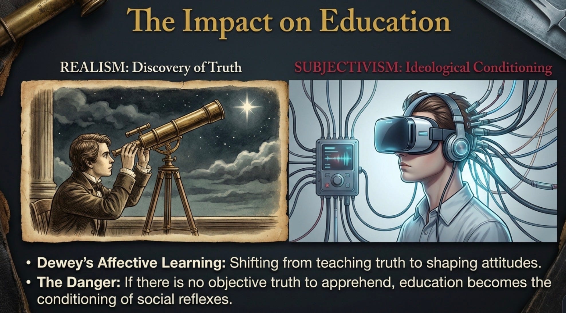 John Dewey’s Affective Learning Pedagogy operationalized this shift by prioritizing emotional and attitudinal outcomes over cognitive mastery. Dewey’s framework ensured that relativism was not merely taught, but practiced as default, making the student’s internal “affect” the arbiter of educational success.