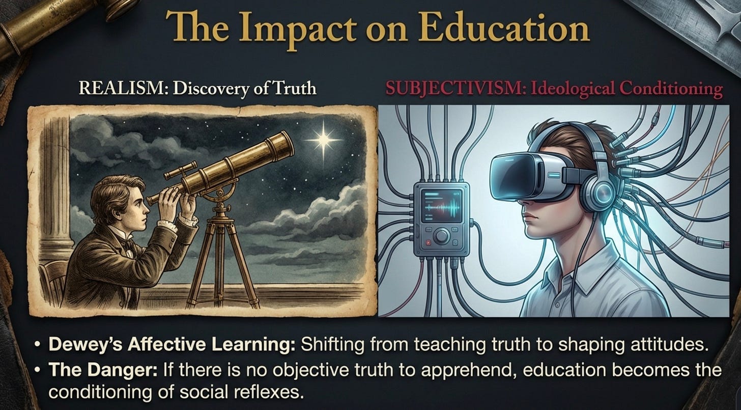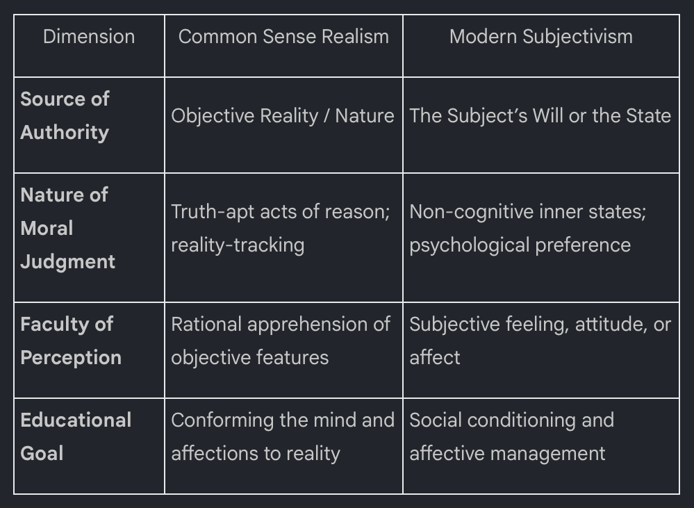 The current crisis in Western educational infrastructure is not merely the result of shifting pedagogical trends, but the consequence of a profound category substitution at the level of foundational metaphysics. The transition from Common Sense Realism to Modern Subjectivism represents a fundamental re-engineering of the curriculum architecture. This shift replaces the rational apprehension of objective reality with the prioritization of non-cognitive psychological states, effectively altering the DNA of institutional mandates. By redefining how the human subject interacts with truth, this pivot neutralizes the concept of an external moral order without necessitating a formal refutation. It is a strategic strike against the epistemological foundations of the Western tradition, rendering objective truth inadmissible within the modern classroom setting.
