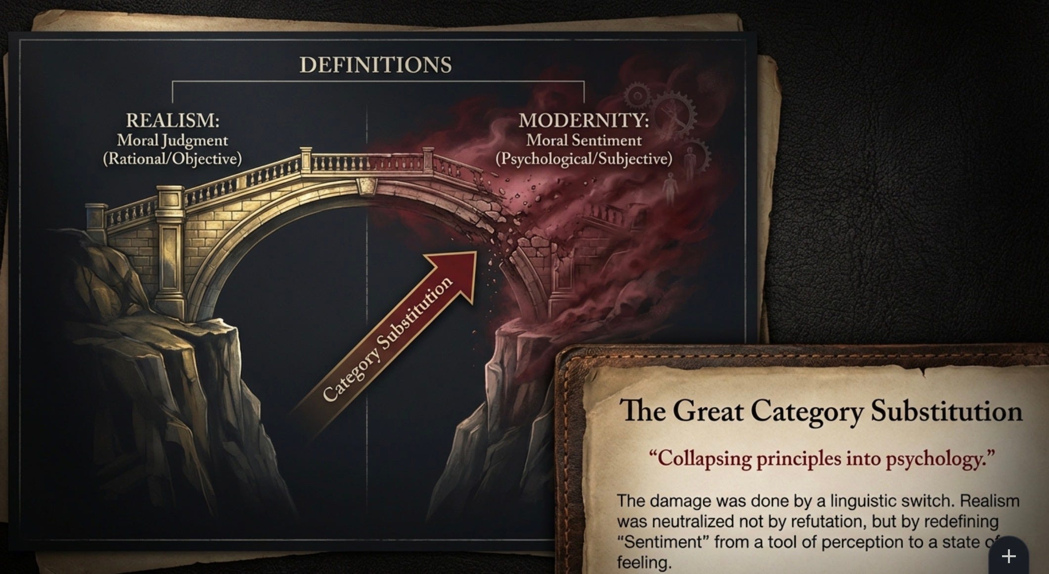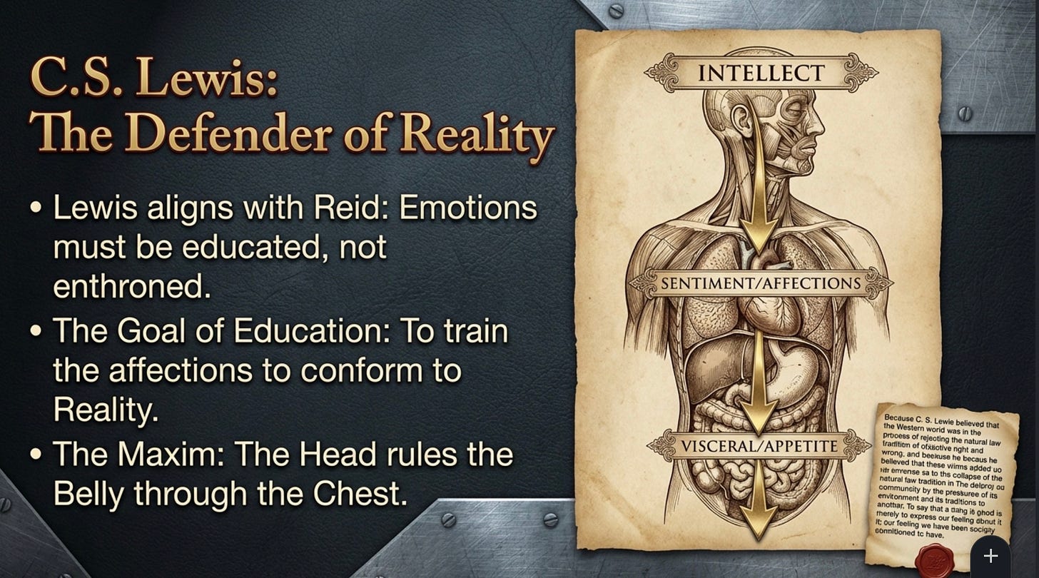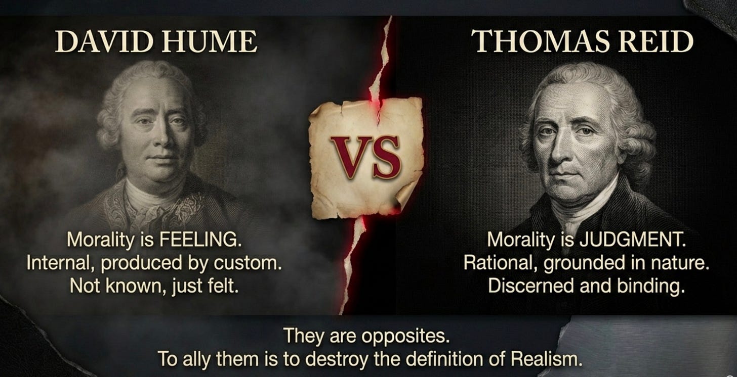 Descending from David Hume, the modern view reduces sentiment to subjective affect; internal feelings produced by ‘custom and association’. In this framework, moral distinctions are merely expressions of approval or disapproval - entirely severed from truth. The modern academic sleight of hand consists of reclassifying Thomas Reid’s cognitive realism as ‘proto-emotivism’ or ‘intuitionism’. By pretending that any non-inferential knowledge must be psychological rather than rational, critics rule out realism in advance. This reclassification erases the first principles of practical reason, replacing self-evident truths with ‘cultural conditioning’. I hope you can discern exactly how the deconstruction ideologues ran with the ball on that and the precise tactical use of that ideal laundering to hollow out and destroy Western Civics and the Western Canon. When objective principles are thus erased from the statutory language of education, they are replaced by the unchecked dictates of unaccountable power. That is how you had your ideological conquest of the academy and education at scale, thereby all the organs of state apparatus and corporate organizational culture.