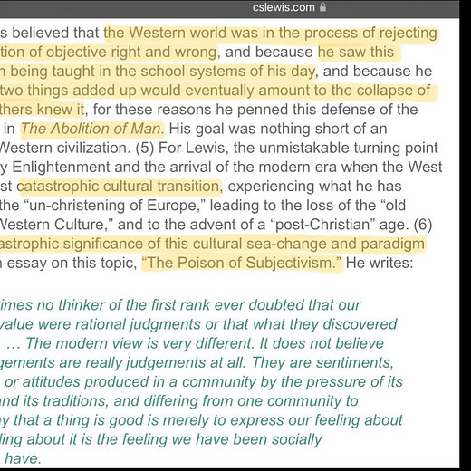 In The Abolition of Man and The Poison of Subjectivism, C.S. Lewis diagnosed the catastrophic cultural transition he termed the ‘un-christening of Europe’. Lewis’s work was an urgent attempt to salvage Western civilization by defending the natural law tradition against the encroachment of Power philosophies. Lewis’s primary directive was the education of conscience and agency, with attention to the role of the emotions in that. He argued that emotions are not generators of value but must be trained to conform to objective reality.