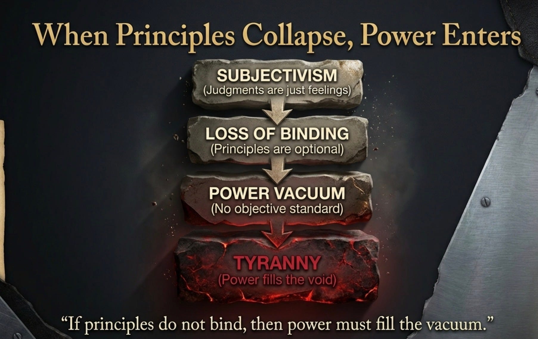 The rotten fruits of subjectivism are now visible in the dissolution of the rule of law and the rise of managerial elitism. We currently occupy an environment where technocratic administration flourishes precisely because objective truth has been rendered inadmissible in the halls of governance.