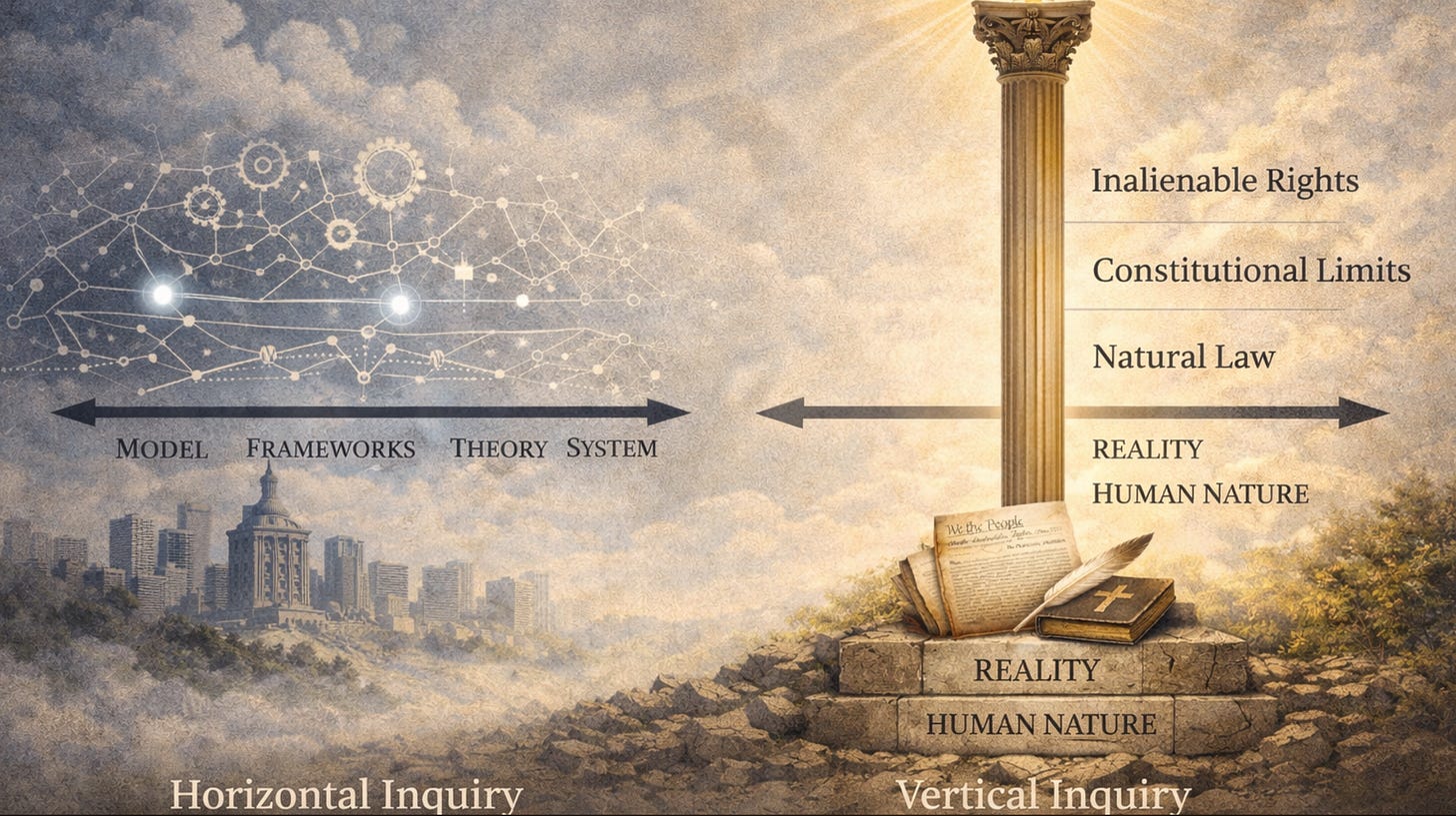 Those premises cannot be evaluated within a horizontal debate about models or systems. They are predicated on the understanding and recognition that reality itself possesses intelligible structure. When discourse remains confined to the horizontal plane of models and frameworks, those ontological premises disappear from view. Rights then are misapprehended as constructs within administrative systems rather than recognitions of what is real. That is why the ability to move vertically (to ask the ontological question) is not merely a philosophical exercise. It is a fundamental civic necessity.